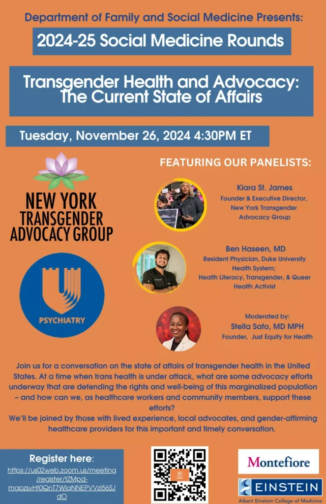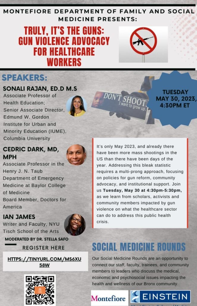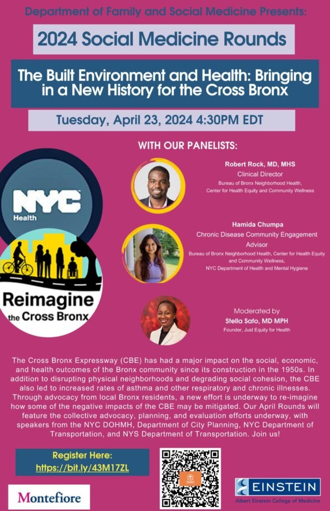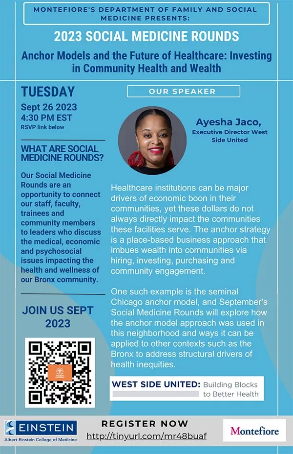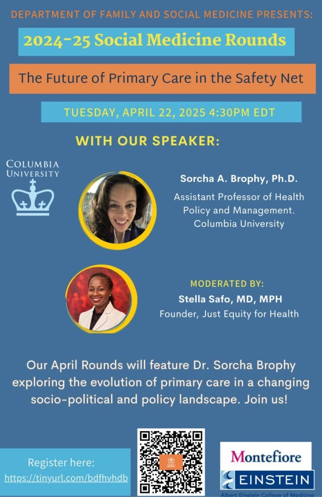 Hosted by Department of Family and Social Medicine, our monthly Social Medicine Rounds are an opportunity to connect our staff, faculty, trainees and community members to leaders who discuss the medical, economic and psychosocial issues impacting the health and wellness of our Bronx community.