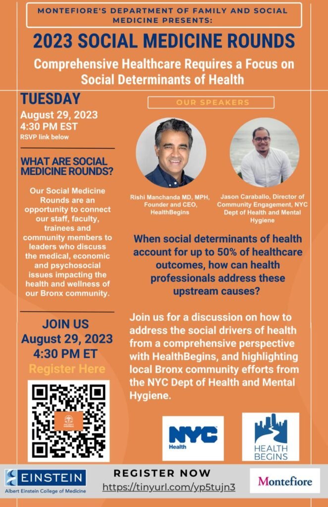 Our Aug Rounds focus on how health professionals can address social determinants of health, with leads from HealthBegins, a national health improvement organization, and the local NYC Dept of Health Bronx Action Center.