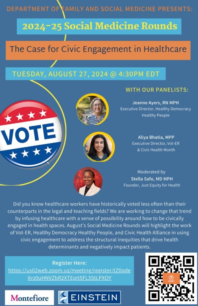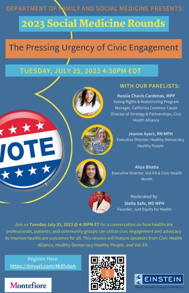 Our July Social Medicine Rounds covered how healthcare professionals, patients, and community groups may utilize civic engagement and advocacy to improve healthcare outcomes for all, and featured speakers from Civic Health Alliance, Healthy Democracy Healthy People, and Vot-ER.