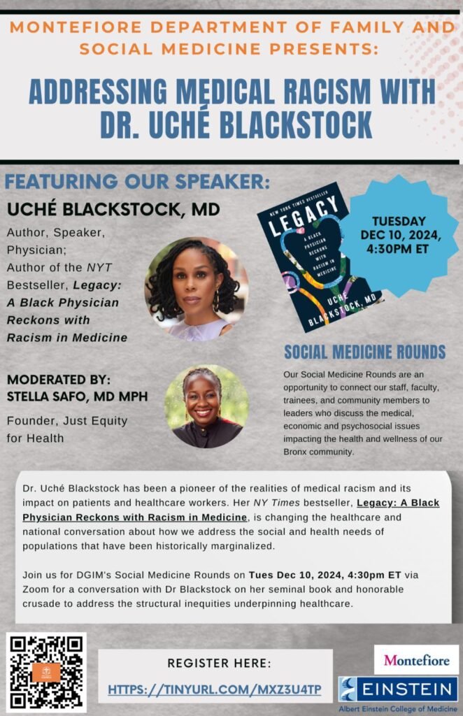 Dr. Uché Blackstock has been a pioneer of the realities of medical racism and its impact on patients and healthcare workers. Her NY Times bestseller, Legacy: A Black Physician Reckons with Racism in Medicine, is changing the healthcare and national conversation about how we address the social and health needs of populations that have been historically marginalized. Our Dec Social Medicine Rounds featured Dr. Blackstock discussing her seminal book and honorable crusade to address the structural inequities underpinning healthcare.
