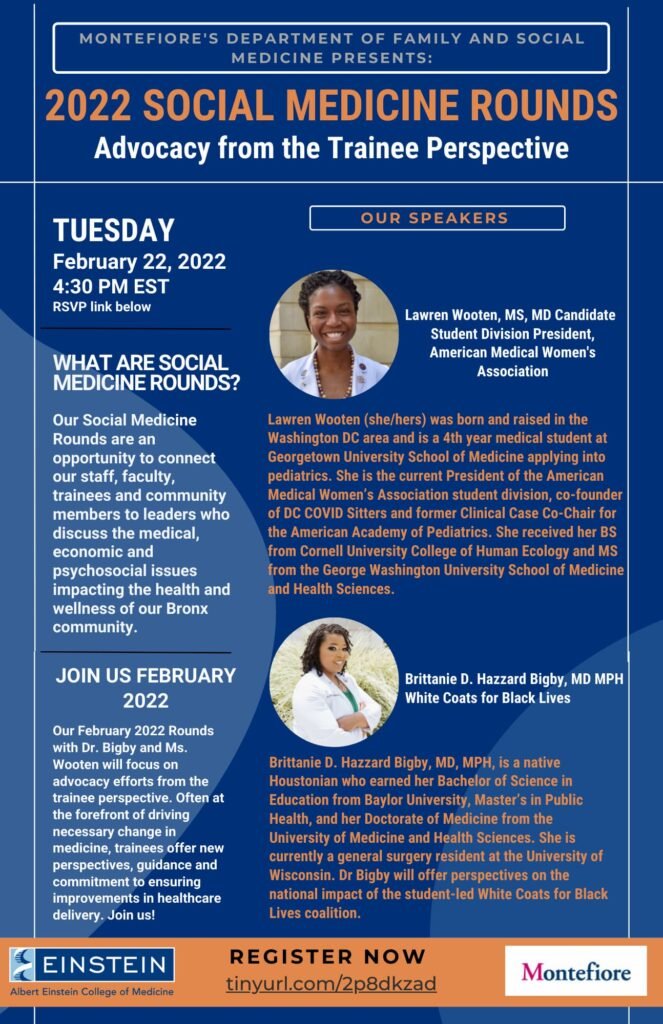 Our February Rounds featured Dr. Bigby and student doctor Ms. Wooten discussing advocacy in medicine as trainees.