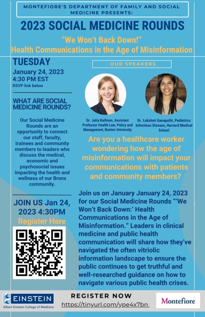 Our January 2023 Social Medicine Rounds “‘We Won’t Back Down:’ Health Communications in the Age of Misinformation,” featured leaders in clinical medicine and public health communication sharing how they’ve navigated the often vitriolic information landscape to ensure the public continues to get truthful and well-researched guidance on how to face various public health crises.