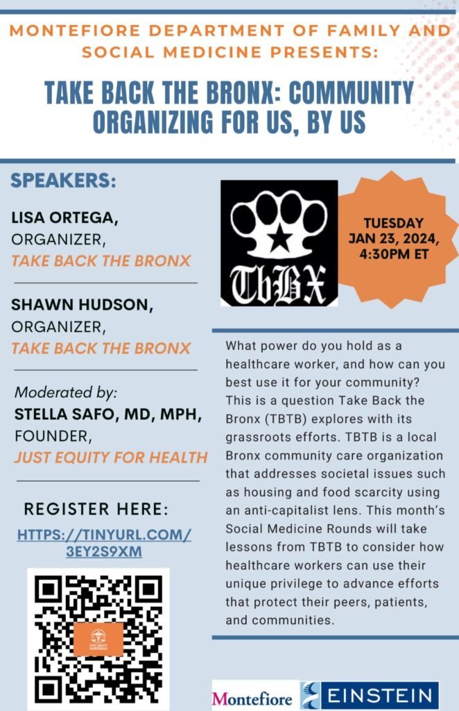 Our January Rounds with Take Back the Bronx (TBTB) explored the power of grassroots community organizing. TBTB is a local Bronx community care organization that addresses societal issues such as housing and food scarcity using an anti-capitalist, abolitionist lens. We considered how lessons from TBTB can impact healthcare workers’ use of their unique privilege to advance efforts that protect their peers, patients, and communities.