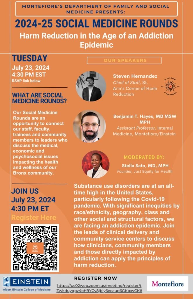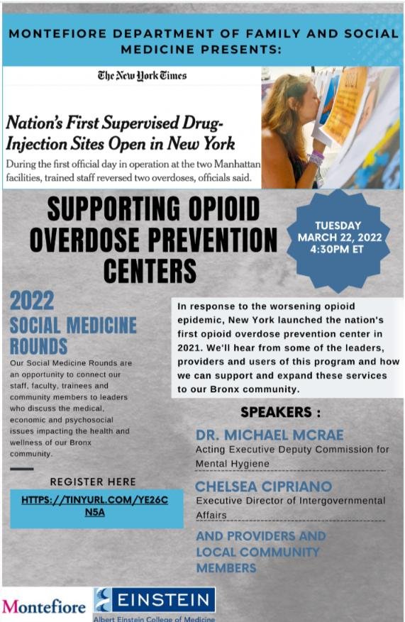 Our March 22nd Social Medicine Rounds, “Supporting Opioid Overdose Prevention Centers,” featured members from the Department of Health discussing harm reduction techniques, including the country’s first opioid prevention centers which opened in NYC in 2021.