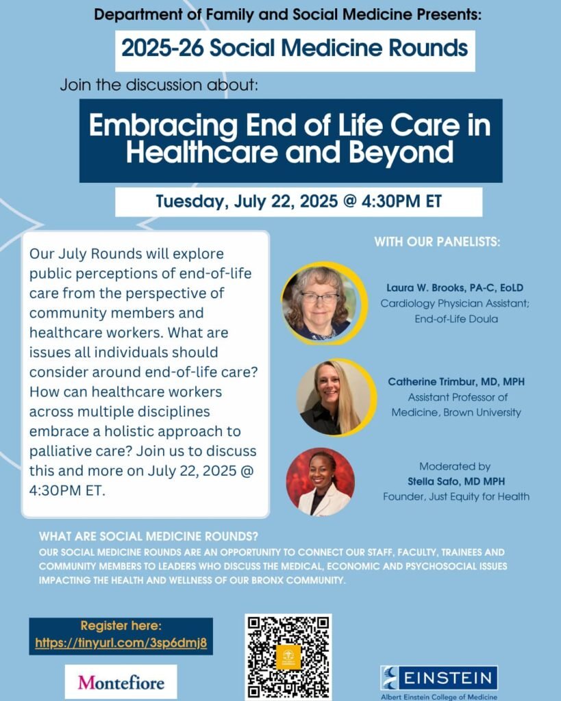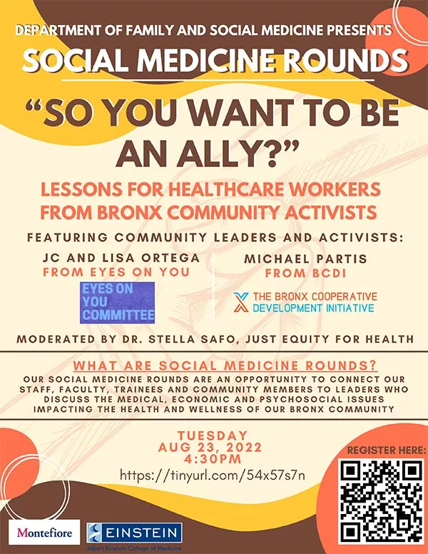 Social Medicine Rounds are open to Montefiore/Einstein’s staff, faculty and trainees; Community members; Patients; and anyone else who’d like to join us virtually. Rounds are held every 4th Tuesday of the month from 4:30-5:45pm ET. For more information, please contact research@justequityforhealth.com.