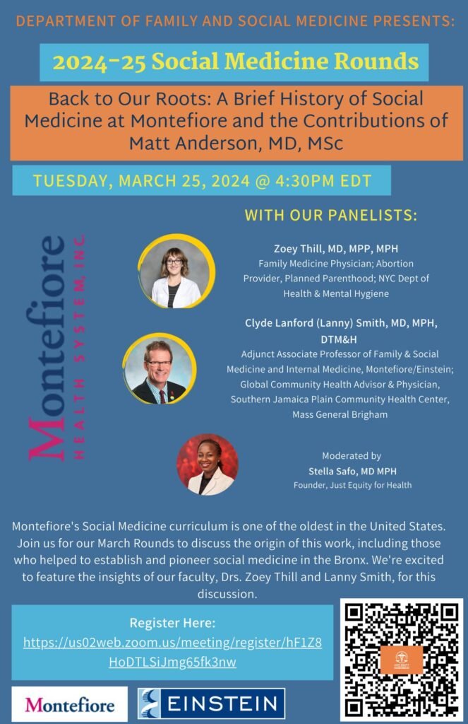 Montefiore’s Social Medicine curriculum is one of the oldest in the United States. Our March Rounds discussed the origin of this work, including those who helped to establish and pioneer social medicine in the Bronx. We were excited to feature the insights of our faculty, Drs. Zoey Thill and Lanny Smith, for this discussion.