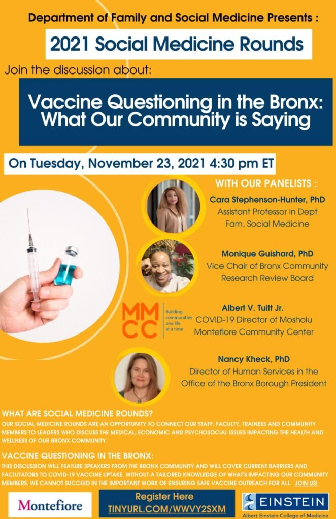 Our November Social Medicine Rounds featured a conversation about barriers and facilitators to Covid-19 vaccine uptake in the Bronx.