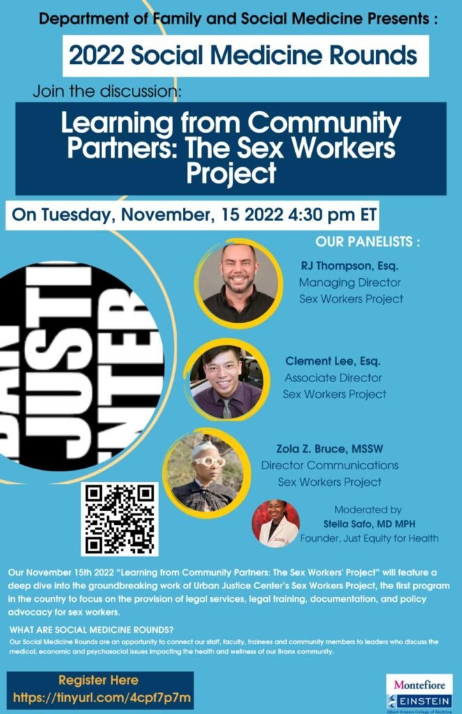 Our November 15th 2022 Social Medicine Rounds, “Learning from Community Partners: The Sex Worker’s Project” featured a deep dive into the groundbreaking work of Urban Justice Center’s Sex Workers Project, the first program in the country to focus on the provision of legal services, legal training, documentation, and policy advocacy for sex workers.