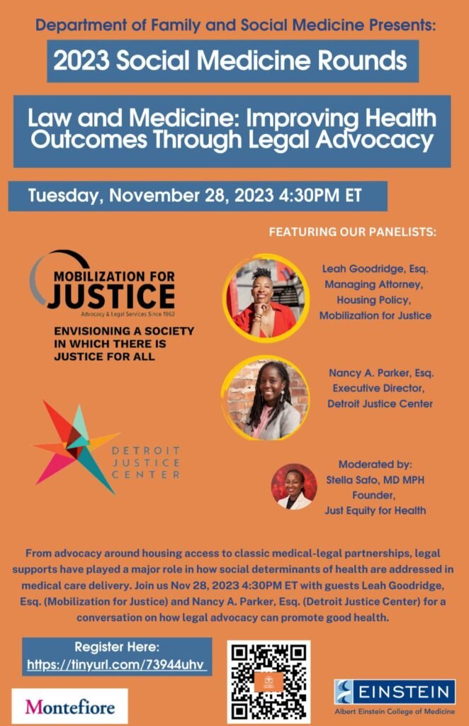 From advocacy around housing access to classic medical-legal partnerships, legal supports have played a major role in how social determinants of health are addressed in medical care delivery. Our Nov 2023 Rounds included speakers Leah Goodridge, Esq. (Mobilization for Justice) and Nancy Parker, Esq. (Detroit Justice Center) for a conversation on how legal advocacy promotes good health.