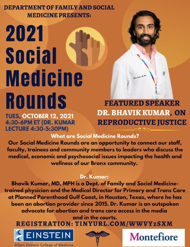 Our October Social Medicine Rounds featured Dept of Family and Social Medicine graduate, Dr. Bhavik Kumar who discussed issues around abortion and trans rights and how central reproductive rights are to the socioeconomic success of a community.