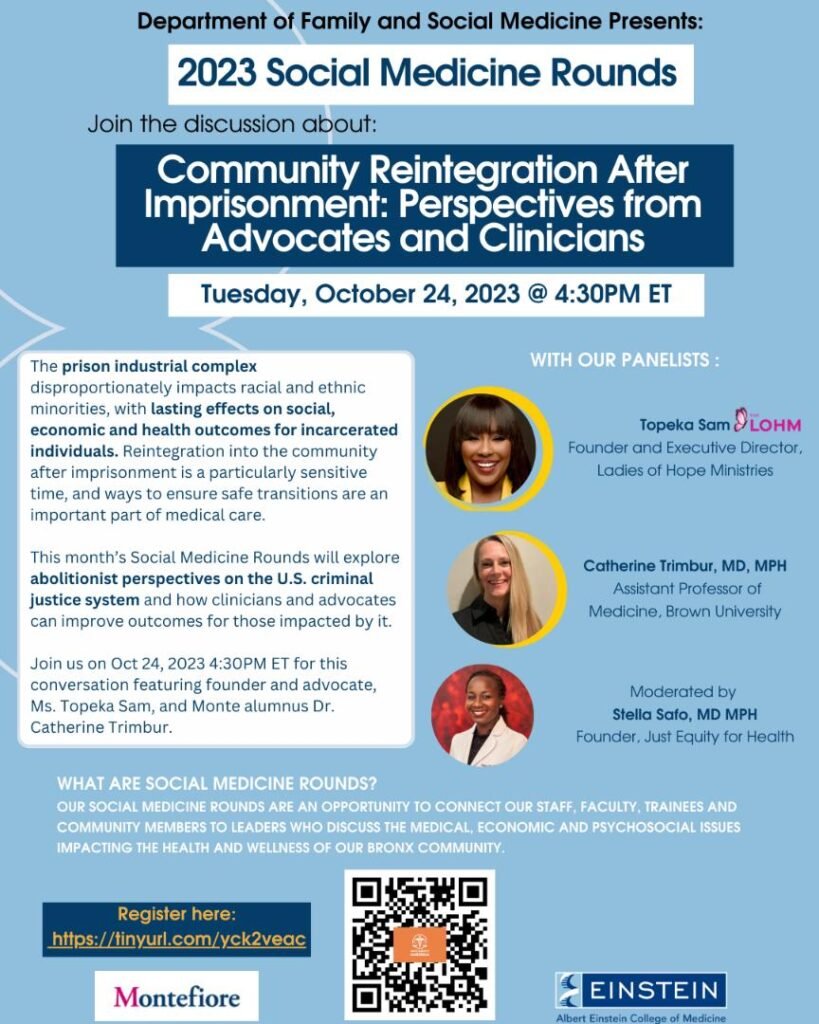 The prison industrial complex disproportionately impacts racial and ethnic minorities, with lasting effects on social, economic and health outcomes for incarcerated individuals. Reintegration into the community after imprisonment is a particularly sensitive time, and ways to ensure safe transitions are an important part of medical care. Our October Social Medicine Rounds explored abolitionist perspectives on the U.S. criminal justice system and how clinicians and advocates can improve outcomes for those impacted by it.