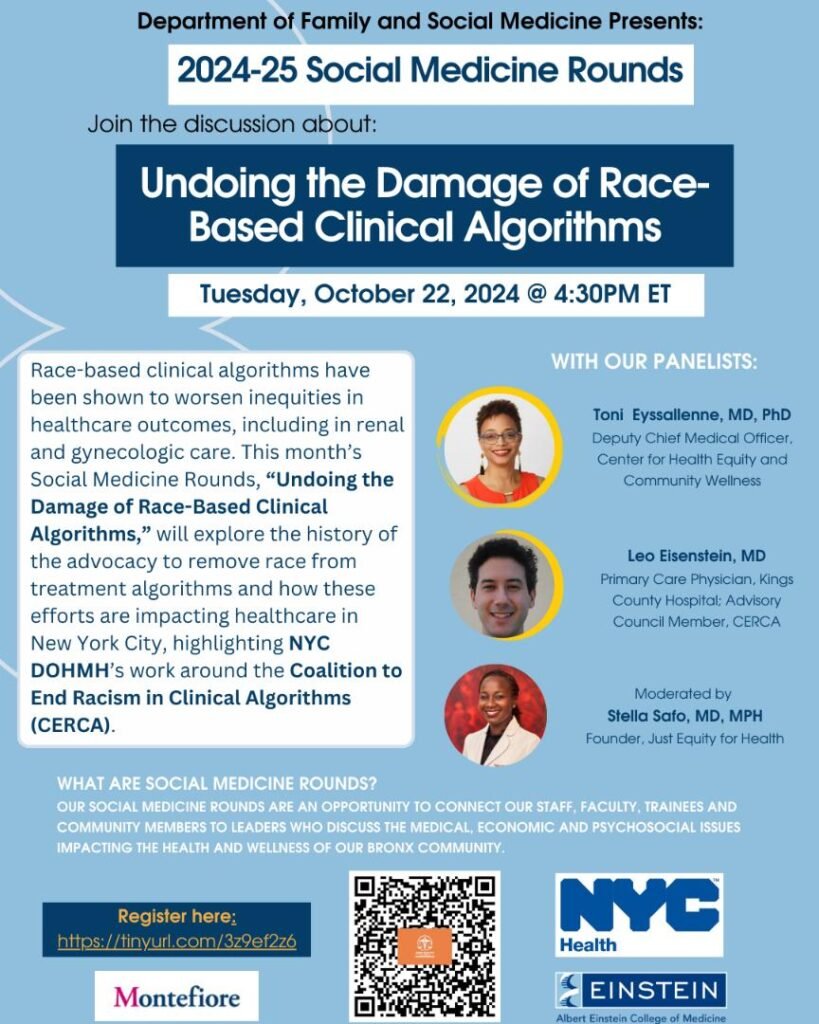 Race-based clinical algorithms have been shown to worsen inequities in healthcare outcomes, including in renal and gynecologic care. October’s Social Medicine Rounds, “Undoing the Damage of Race-Based Clinical Algorithms,” explored the history of the advocacy to remove race from treatment algorithms and how these efforts impact healthcare in New York City, highlighting NYC DOHMH’s work around the Coalition to End Racism in Clinical Algorithms (CERCA).