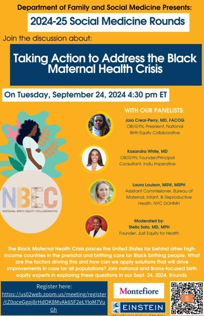 The Black Maternal Health Crisis places the United States far behind other high-income countries in the prenatal and birthing care for Black birthing people. Our Sept Social Medicine Rounds examined the factors driving birth inequities and how we apply solutions for care, with national and Bronx-focused birth equity experts.