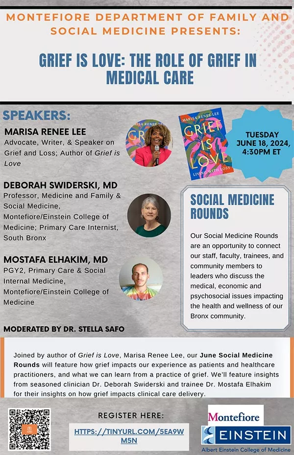 Joined by author of Grief is Love, Marisa Renee Lee, our June Social Medicine Rounds featured how grief impacts our experience as patients and healthcare practitioners, and what we can learn from a practice of grief. This session provided insights from seasoned clinician Dr. Deborah Swiderski and trainee Dr. Mostafa Elhakim.