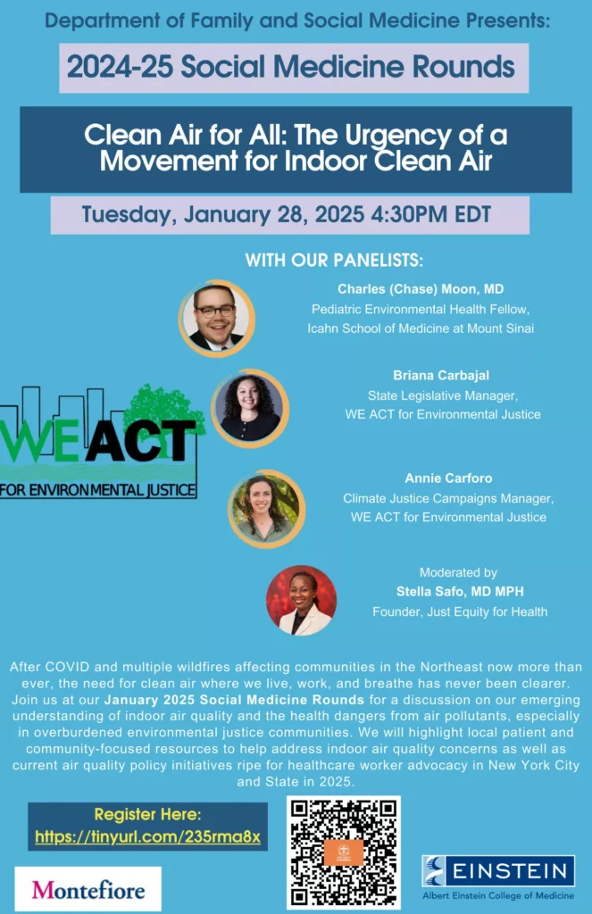 After COVID and multiple wildfires affecting communities in the Northeast now more than ever, the need for clean air where we live, work, and breathe has never been clearer. Our January 2025 Social Medicine Rounds discussed our emerging understanding of indoor air quality and the health dangers from air pollutants, especially in overburdened environmental justice communities. We highlighted local patient and community-focused resources to help address indoor air quality concerns as well as current air quality policy initiatives ripe for healthcare worker advocacy in New York City and State in 2025.