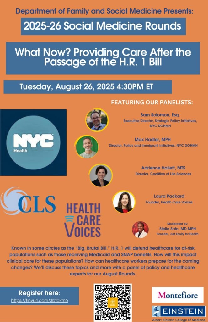 Known in some circles as the “Big, Brutal Bill,” H.R. 1 will defund healthcare for at-risk populations such as those receiving Medicaid and SNAP benefits. How will this impact clinical care for these populations? How can healthcare workers prepare for the coming changes? We’ll discuss these topics and more with a panel of policy and healthcare experts for our August Rounds.